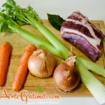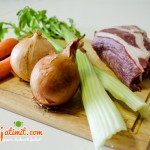 - Lajmë mirë perimet. Qepës i heqim vetëm lëkurën e sipërme. Marrim një tenxhere me ujë dhe hedhim karrotat, selinonë, qepën, dafinën dhe në fund mishin, i shtojmë edhe kripë.
