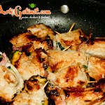 - Marrim fetat e mishit, shtrojmë sipër një fetë proshutë dhe një fetë kungulli. Më pas i mbledhim dhe i bëjmë rolè. I mbyllim me një ose dy kruajtëse dhëmbësh. Vazhdojmë në këtë mënyrë me të gjitha fetat e mishit.
