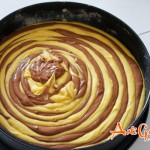 - Ndajmë masën e përgatitur në dy pjesë të barabarta. Në njërën shtojmë kakaon e në tjetën niseshtenë e mbetur. Marrim një tavë të rrumbullakët, e lyejmë me pak miell e gjalpë që të mos ngjitet e fillojmë të hedhim në të dy lugë me përbërjen e bardhë, sipër hedhim 2 lugë nga ajo me kakao, më pas përsëri 2 lugë të bardhë e vazhdojmë kështu me radhë deri sa të mbarojë e gjithë përgatitja.