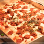- E fusim tavën të piqet në furrë të nxehtë 200°C përreth 10 minuta. Më pas e heqim tavën nga furri dhe i hedhim sipër copat e salçiçes, mocarelën dhe pak vaj ulliri. E vendosim përsëri tavën në furrë derisa të shohim që pica është pjekur.