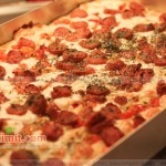 - Pasi kemi përgatitur brumin, marrim një tavë të madhe dhe e lyejme me pak vaj ulliri, ( mund ta bëjmë ëdhe në dy tava nëse dëshirojmë). Hapim me dorë me kujdes brumin e përgatitur. Duhet ta mbulojmë gjithë tavën. Më pas me majat e gishtave e shtypim brumin me kujdes. I hedhim sipër copat e domates. I hapim mirë mbi brumin. Pastaj i hedhim pak kripë, rigon dhe gjethet e borzilokut.