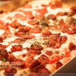 - Ndërkohë që presim brumin të vijë, marrim mocarelën dhe e presim në copa, presim gjithashtu në copa domatet dhe salçiçet.