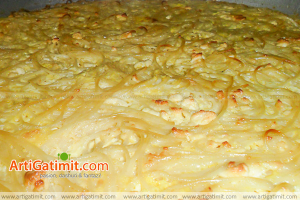 - Marrim një tepsi dhe e lyejmë me gjalpë. Hedhim në të masën e përgatitur. E sheshojmë mirë. Sipër i hedhim copa gjalpi dhe djathë të grirë.