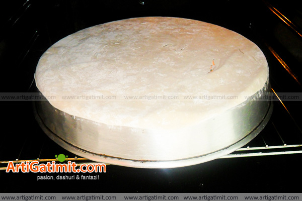 - Brumi duhet të jetë elastik. Vendosim brumin në një enë qelqi ku e mbulojmë me një pecetë të pastër. E lemë të pushojë përreth 20 minuta.