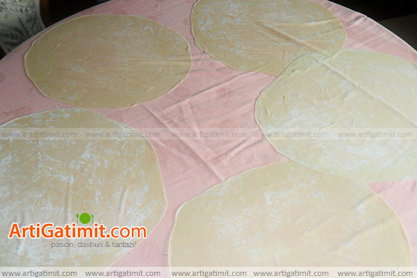 - Më pas e ndajmë brumin në toptha të vegjël, rreth 15. Hapim një e nga një petët duke u ndihmuar nga pak niseshte që të mos ngjiten.
