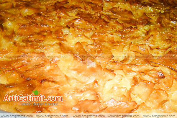 - Pastaj në një tepsi të lyer me gjalpë hedhim masën e përgatitur. Vendosim tepsinë me yshmer të piqet në furrë të nxehtë 220°C përreth 40 minuta.