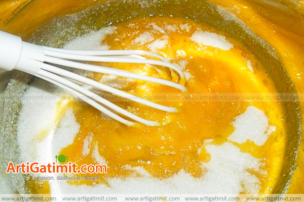 - Në një enë qelqi të madhe hedhim vezët dhe sheqerin. I rrahim mirë. Më pas shtojmë gjalpin e shkrirë e të ftohtë.