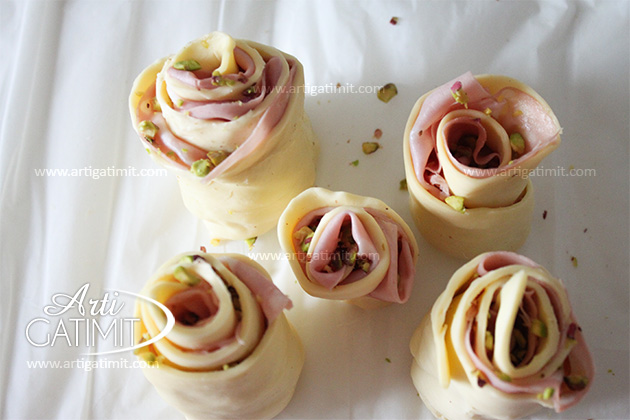 - Sipër çdo shiriti të prerë vendosim copë djathi dhe proshute, (duhet të kemi kujdes që të mbulojmë të gjithë petën). Sipër i hedhim fistikë të grirë. Mbyllim petën në formë role dhe krijojmë me të një lloj luleje si gonxhe trëndafili.