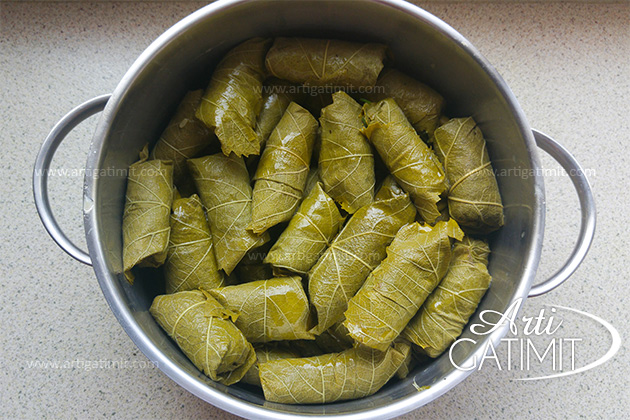 - Hapen gjethet e rrushit dhe hidhen në to nga një gjysmë luge mbushje në çdo gjethe. Kujtojmë që pjesa e ashpër e gjetes duhet të ngelet brenda japrakut. Mbështillet mbushja me gjethet dhe vendosen me kujdes me radhë në tenxhere.