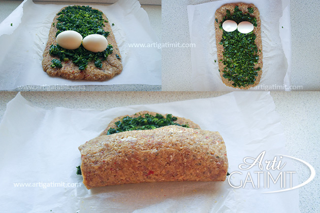 - Mishin e grirë e hapim me dorë në formë drejtkëndëshi. Sipër hapim spinaqin të cilin e kemi futur në ujë të nxehtë me kripë dhe e kemi kulluar. Vendosim 2 vezët e ziera dhe mbledhim në formë roleje. Procesi është treguar dhe i ilustruar me foto.
