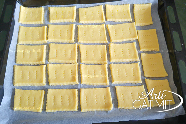 - Biskotat i presim në forma drejtkëndëshe ose format që dëshirojmë. Biskotat i vendosim në një tavë të lyer pak me gjalpë.