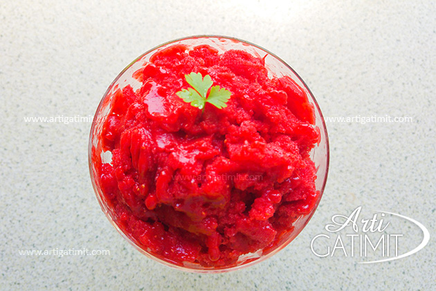 - E futim përsëri në frigorifer për 1 orë tjetër. E nxjerrim dhe e punojmë përsëri të gjithë masën me pirua. Kjo përsëritet edhe njëherë tjetër dhe granita me luleshtrydhe të freskëta është gati.