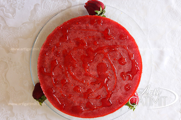 - Masën e hedhim te luleshtrydhet e grira. E trazojmë të përzihen masat dhe me kujdes e hedhim në tavë ,duke e hapur në të gjithë sipërfaqen. Ëmbëlsirën me luleshtrydhe e futim përsëri në frigorifer edhe 2 orë të tjera.