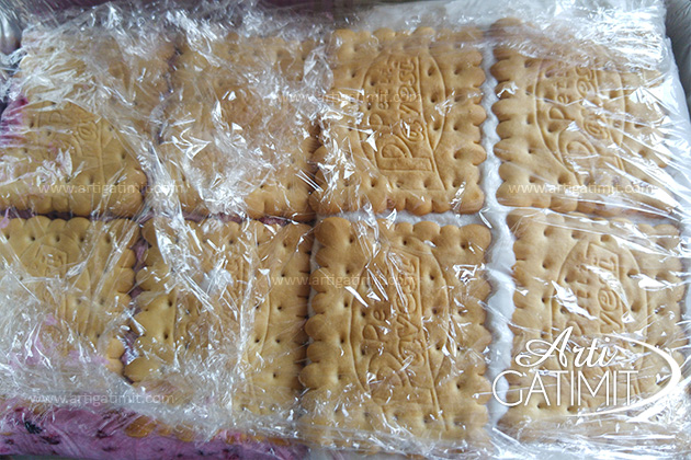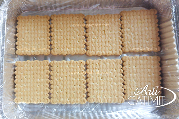 - Në një tavë katrore shtrojmë qeske kuzhine dhe vendosim radhë gjysmat e biskotave.