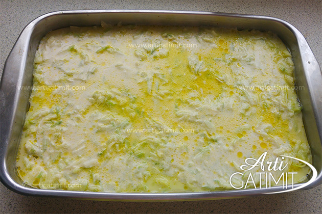 - Në një tavë të lyer me vaj hedhim pak më shumë se gjysma e brumit që përgatitëm në fillim, sa të mbuloi të gjithë sipërfaqen e tavës. Sipër do të hedhim masën e kungullit duke e shpërndarë në të gjithë tavën. Sipër kungullit do të hedhim gjalpin dhe pjesën tjetër të brumit. Foto në vijim tregon kungullin në tavë përpara se ta pjekim në furrë.