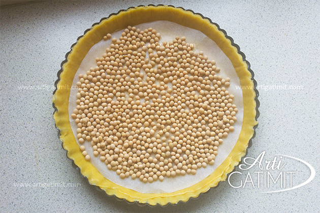 - Marrim brumin që përgatitëm dhe e vendosim në tavën e pjekjes ku kemi shtruar një letër kuzhine. Tava që kemi përdorur është rreth 28 cm dhe me bordurë. Petën e shpojmë në shumë vende me pirua. I vendosim sipër një letër kuzhine, sipër letrës e mbushim me oriz apo fasule, që do të shërbejnë si kundërpeshë, dhe e futim në furrë të para ngrohur në 180°C për 10 minuta. Pasi piqet peta heqim letrën sipër dhe e lemë të ftohet.