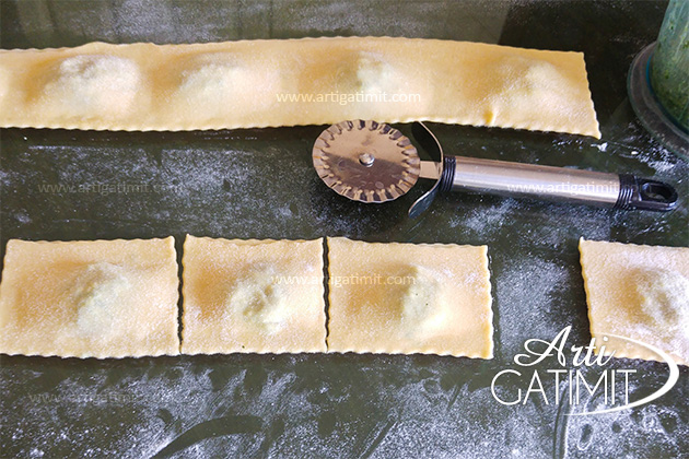 - Vendosim një pjesë të shiritit sipër dhe e ngjeshim me kujdes me dorë, në vendet bosh. Presim ravioli me spinaq në çdo ndarje. Nga prerja dalin forma katrore të mbushura të cilat i ngjeshim pak anash që të mos na dalin mbushja gjatë zierjes.