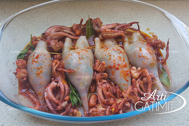 - Marrim kallamarët një e nga një dhe hedhim ne brendësi nga mbushjet që përgatitem deri në gjysmë me anë të një luge duke i qepur me kunja druri (kunja dhëmbësh). I rreshtojmë kallamar mbushur në tavën të lyer me vaj ulliri.