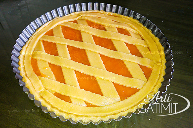 - Krostata me reçel kajsie është gati për tu pjekur, tavën e futim në furrë të para ngrohur për 20-30 minuta.