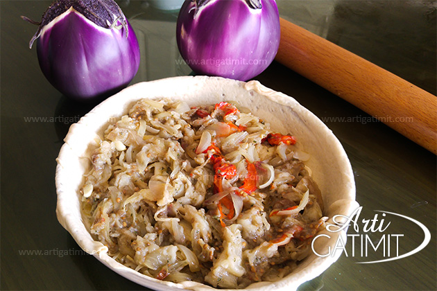 Për të përgatitur pite me patëllxhan kemi përdorur dy petë, një poshtë mbushja në mes me patëllxhan dhe një petë tjetër sipër. E shkëlqyeshme për të shërbyer në darkë si meze dhe e servirur e prerë në copa.