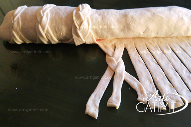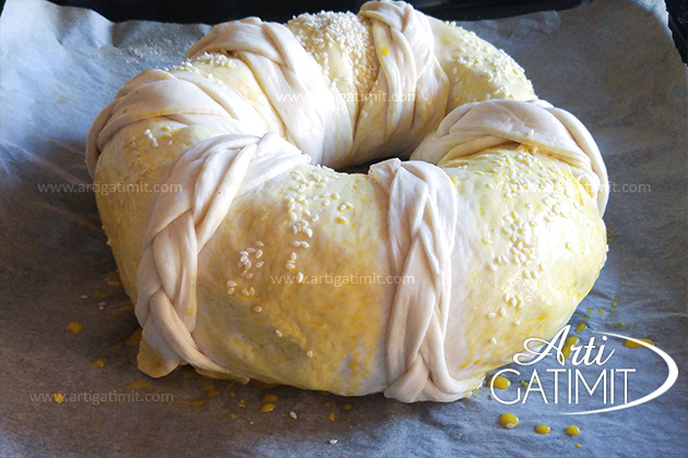 - Kulaç i mbushur është pothuajse gati, e mbbështjellim rulo, bëjmë gërshetat dhe i kalojmë nga sipër si në figurë. Rrahim të verdhën e vezës me pak qumësht dhe e lyejmeë me anë të një furçe. Sipër i hedhim pak susam.