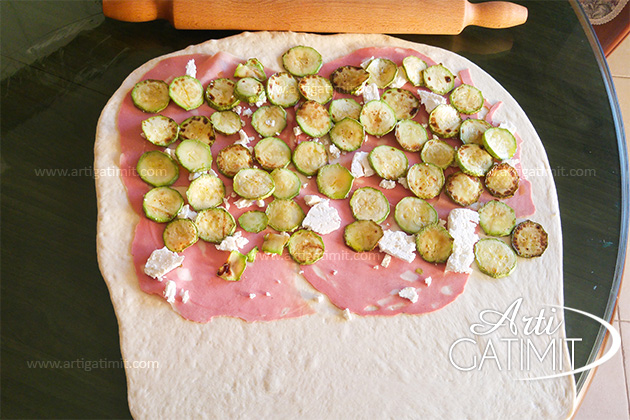 - Bëjmë mbushjen e kulaçit. Vendosim në fillim proshutën duke e hapur në një pjesë të brumit, rikotën dhe sipër vendosim kungulleshkat si në figurë, duke lënë një pjesë bosh për të bër gërshetat.