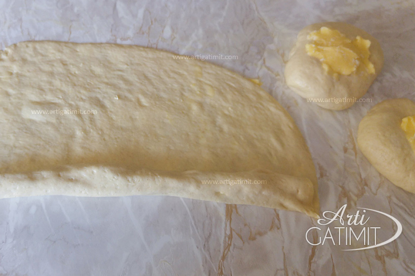 - Topthat i hapim me dorë në formë pete, duke hapur edhe gjalpin. Petën e mbledhim role dhe më pas i japim formën.