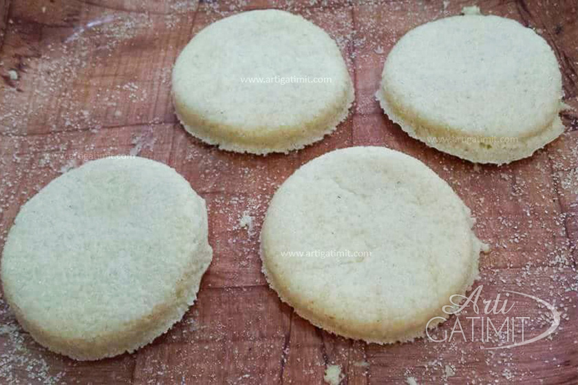 - Me ndihmën e një peci të trashe ose me pëllëmbën e dorës hapim brumin mbi planin e punës. Me ndihmën e një rrethi ose të një gote bëjmë format. Format nuk duhet të jenë as shumë të holla dhe as të trasha me qëllim që të piqen nga brenda.