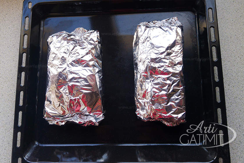- E mbledhim me kujdes në formën e një pakete, në fillim me letrën e kuzhinës pastaj me të aluminit. Kështu avulli i perimeve qëndron i gjithë brenda dhe mishi bëhet shumë i shijshëm.