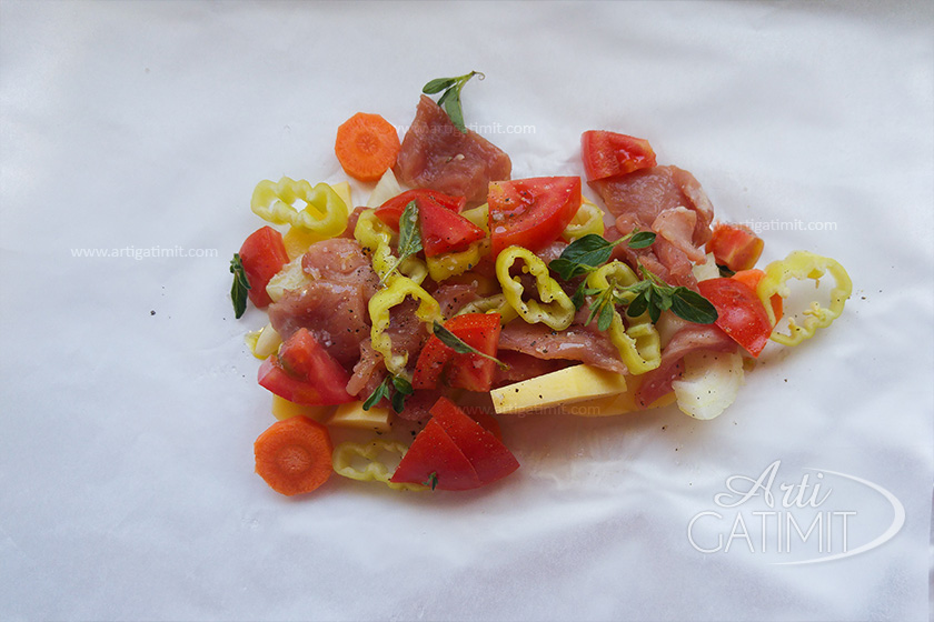 - Përbërësit që përgatitëm i vendosim sipër letrës duke i ndarë në mënyrë të barabartë. Hedhim patatet, mishin, specat, pomodorini, hudhra, djathë në copa, kripë, erëza dhe e spërkatim me vaj ulliri.
