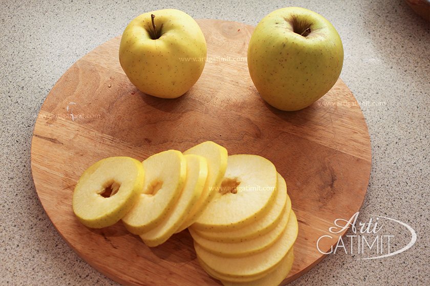 - Fillimisht marrim mollët të cilat duhet të pastrohen mirë nga farat dhe i presim në feta sa më të rregullta për më shumë lehtësi gjatë skuqjes. Fetat e mollës i vendosim në brumin e përgatitur dhe i lyejmë mire nga te dyja anët.