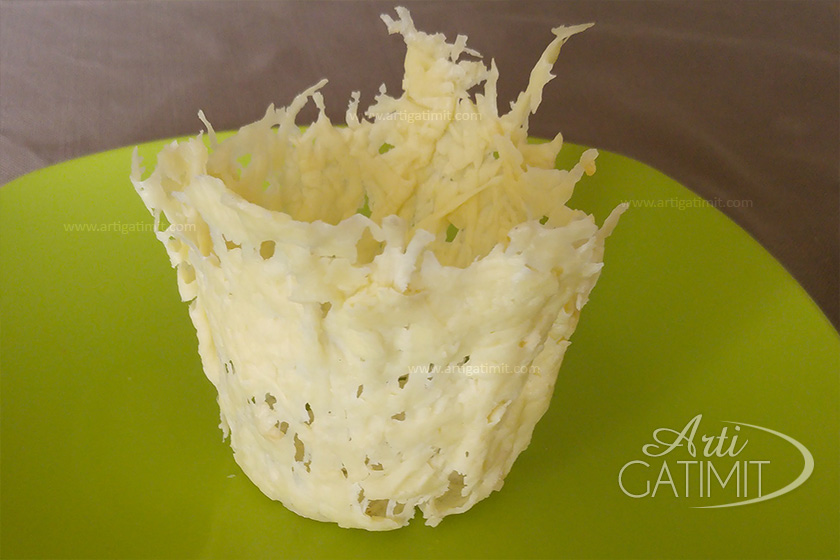 - Më pas e nxjerrim tavën, e marrim djathin, direkt të nxehtë, me anë të një shpatulle dhe e çojmë mbi fundin e një gote. Me të dyja duart djathit i japim formën e enës.