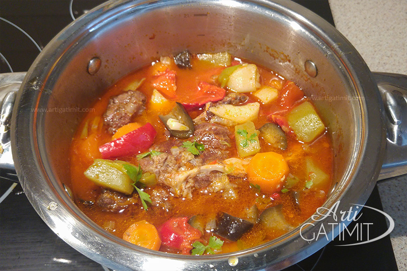 Përgatitja është e thjeshtë dhe shija si gjithmonë fantastike. Për të gatuar mish viçi turli perimet mund ti alternoni sipas dëshirës.